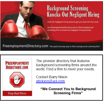 ADDITIONAL INFORMATION Please mail your payments by check to PreemploymentDirectory.com at 22701 Woodlake Lane, Lake Forest, CA 92630. Payments by credit card will be processed through PayPal with an online invoice sent to you for payment. Credit card payments via PayPal will be charged a 3% processing fee. Act now to get the Premium advertising space of your choice. Remember, annually we sell out of our Premium Ads so don't delay. I have enclosed a link to the Reservation Forms for your convenience. Send your Reservation form in today to wbnixon@preemploymentdirectory.com or fax to 1-949-597-0977. Please email me with any questions or contact me at 1-949-770-5264. Thanks and have a fabulous day! Stop Bad Hires http://www.preemploymentdirectory.com/ |